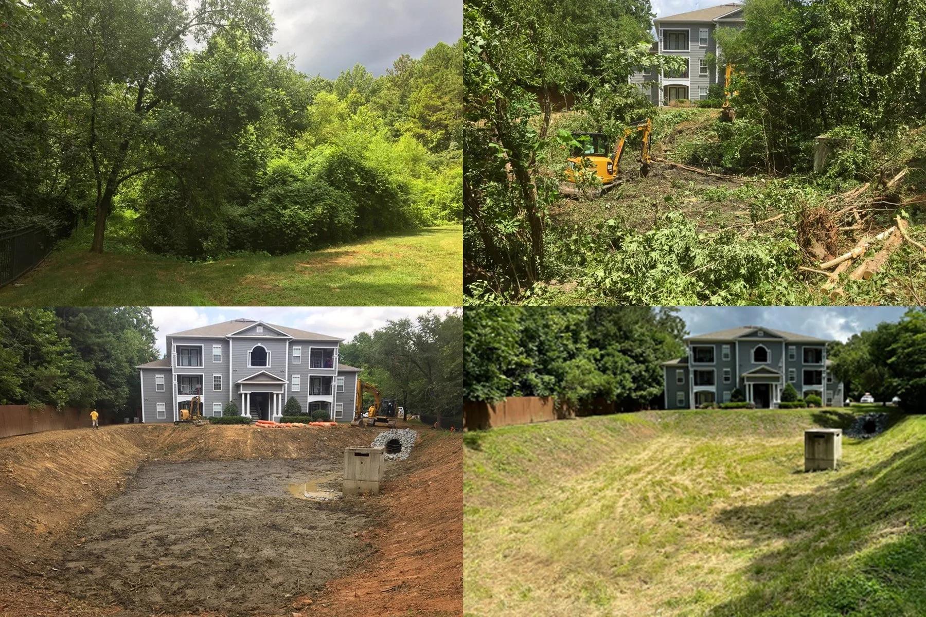 “This apartment community dry pond became completely overgrown due to neglect and lack of maintenance. Team Dragonfly restored the dry pond to function as designed, and a Dragonfly routine maintenance plan has kept it compliant and healthy since.”
