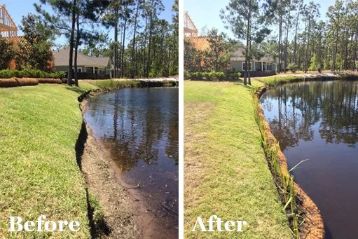 Biodegradable coir logs (made from coconut fiber) stabilize banks while allowing native aquatic plants to take root and strengthen the shoreline over time—restoring a natural look and function.